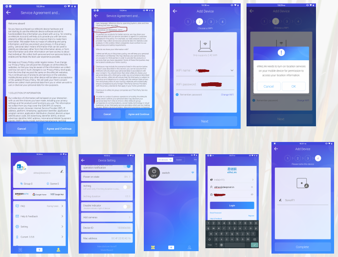 Screenshots of a mobile application that not only requires you to share personal information (email address, location etc.), create an account and then use this app exclusively to operate the wireless switch. The wireless application also sends operating data to those operating the app’s backend service.