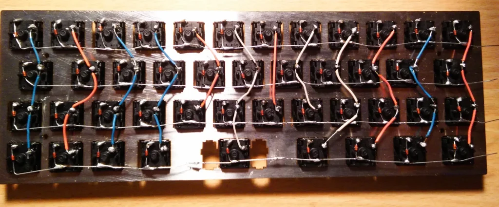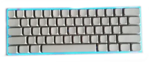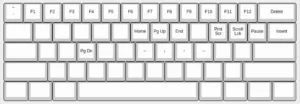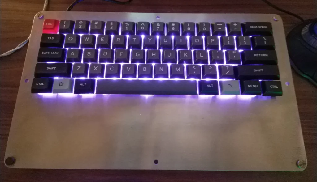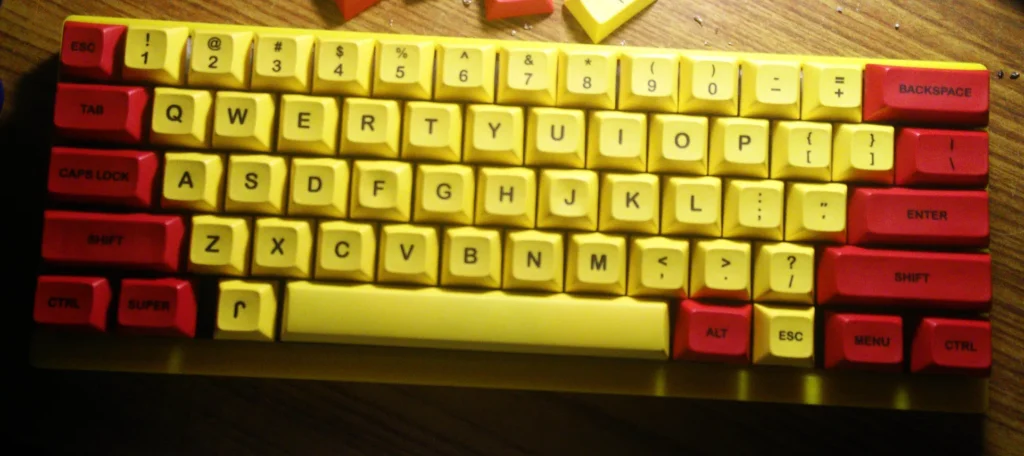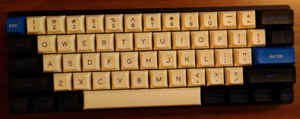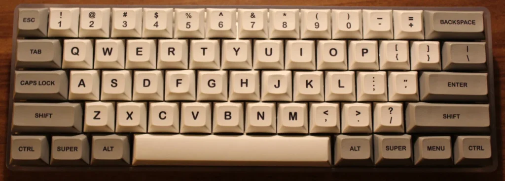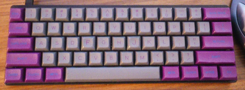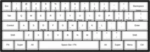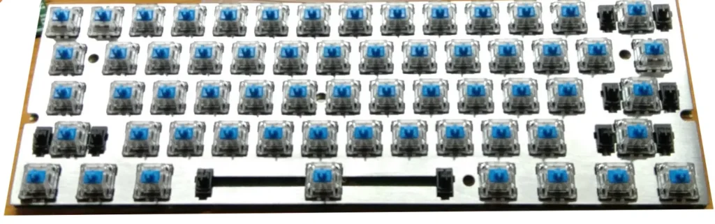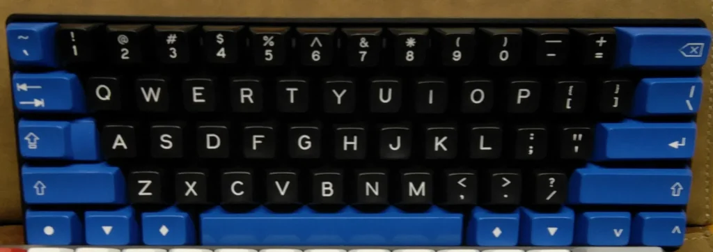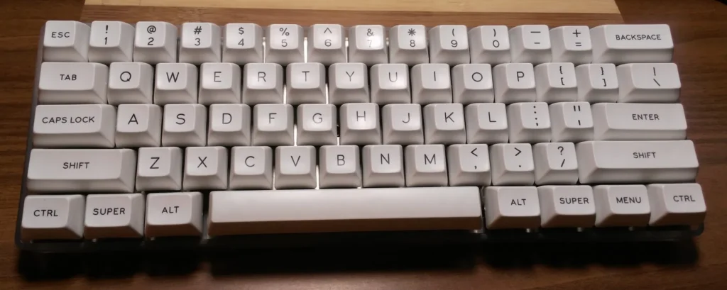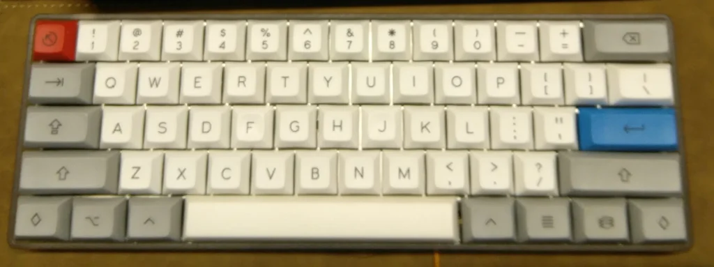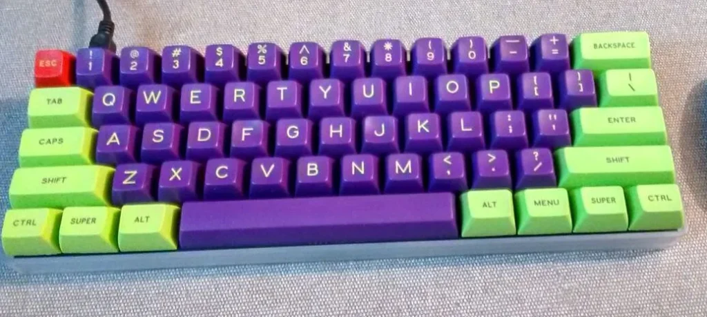 This is a standard 61-key staggered keyboard layout. The key switches are arranged in rows just like most popular keyboard layouts. Keys such as arrow keys and function keys are present on a layer switchable using a function key.