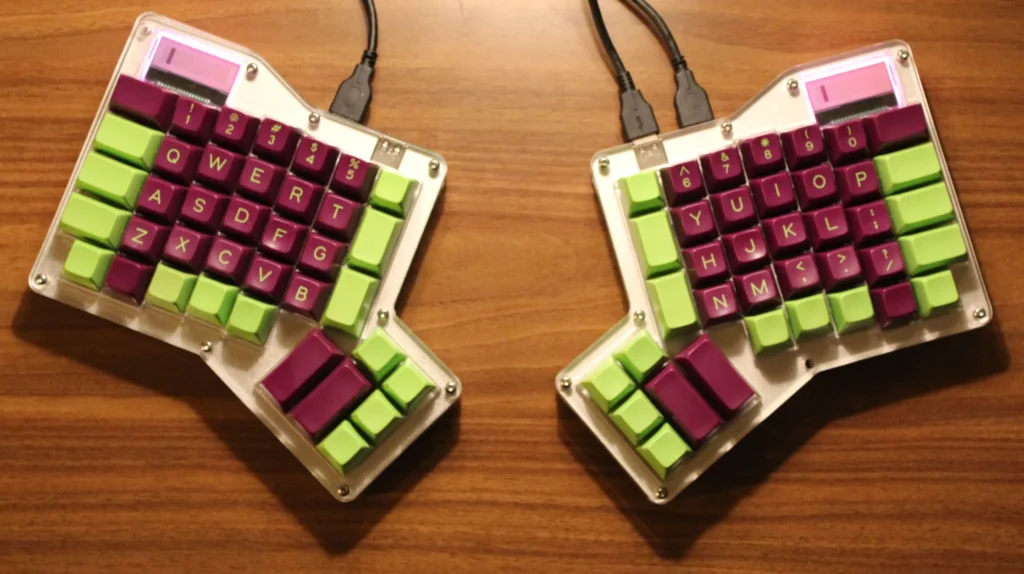 This is a 42-key columnar and split layout. It is called the Atreus layout designed by Phil Hagelberg. It is a small, light-weight and portable ortholinear keyboard which uses the popular 40% keyboard layout.