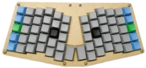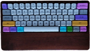This is a 62-key columnar and split keyboard layout. The key switches are arranged in columns (also called an ortholinear layout). Additionally, the keyboard is split into a left and right half – both rotated at an angle.